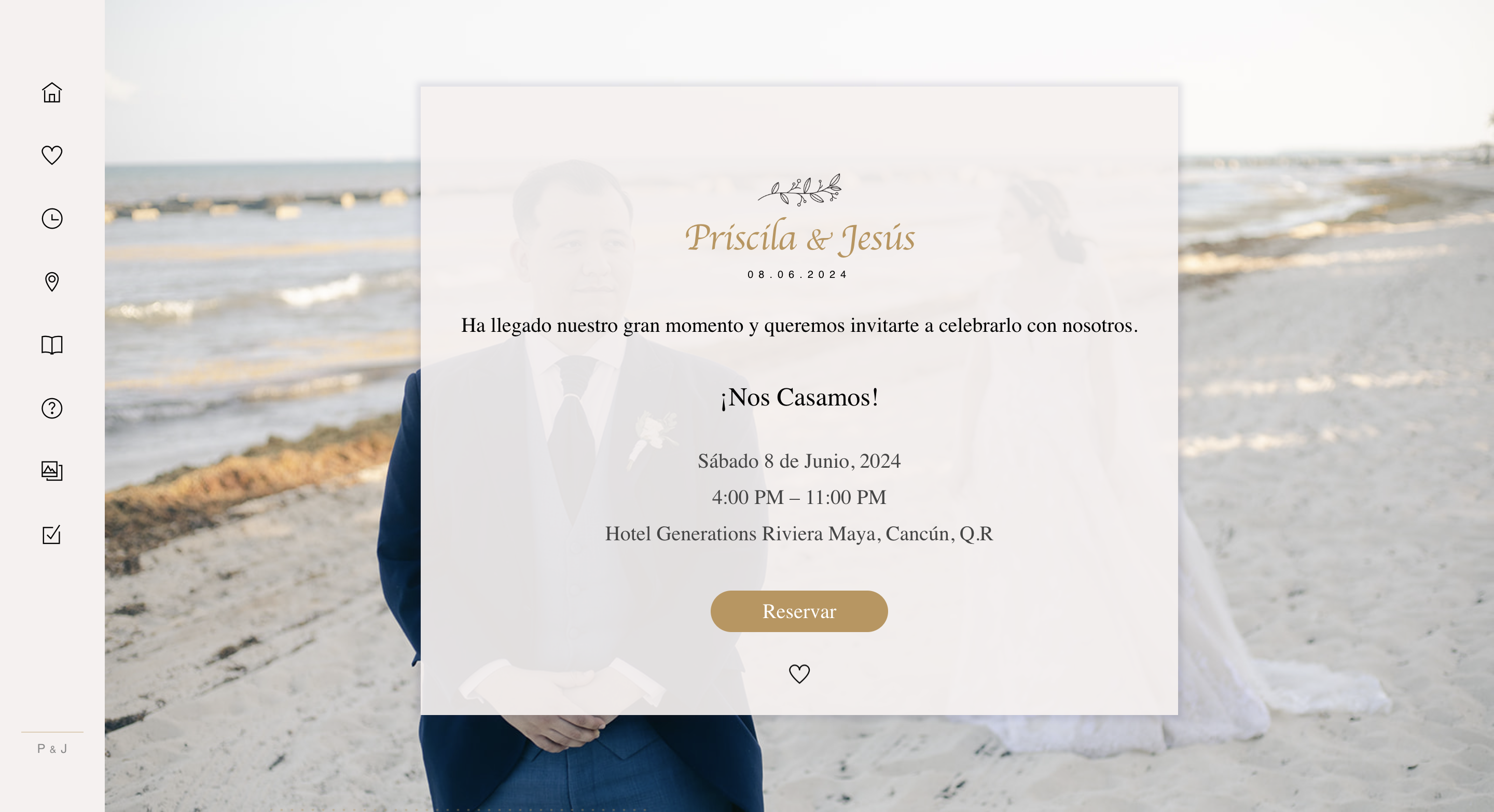 Página Web con sección nuestra historia, mesa de regalos, contador de días, galería, itinerario, RSVP, y código de vestimenta